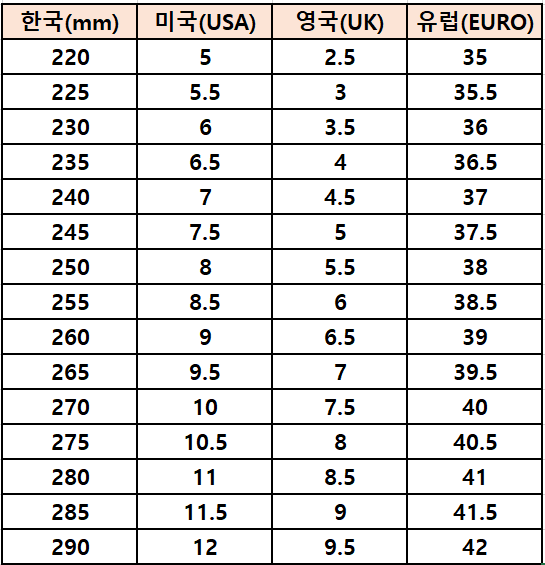 만약 해외사이트를 통해 구매하실 예정이라면, 아래의 사이즈 표를 참고하여 구매해주세요.