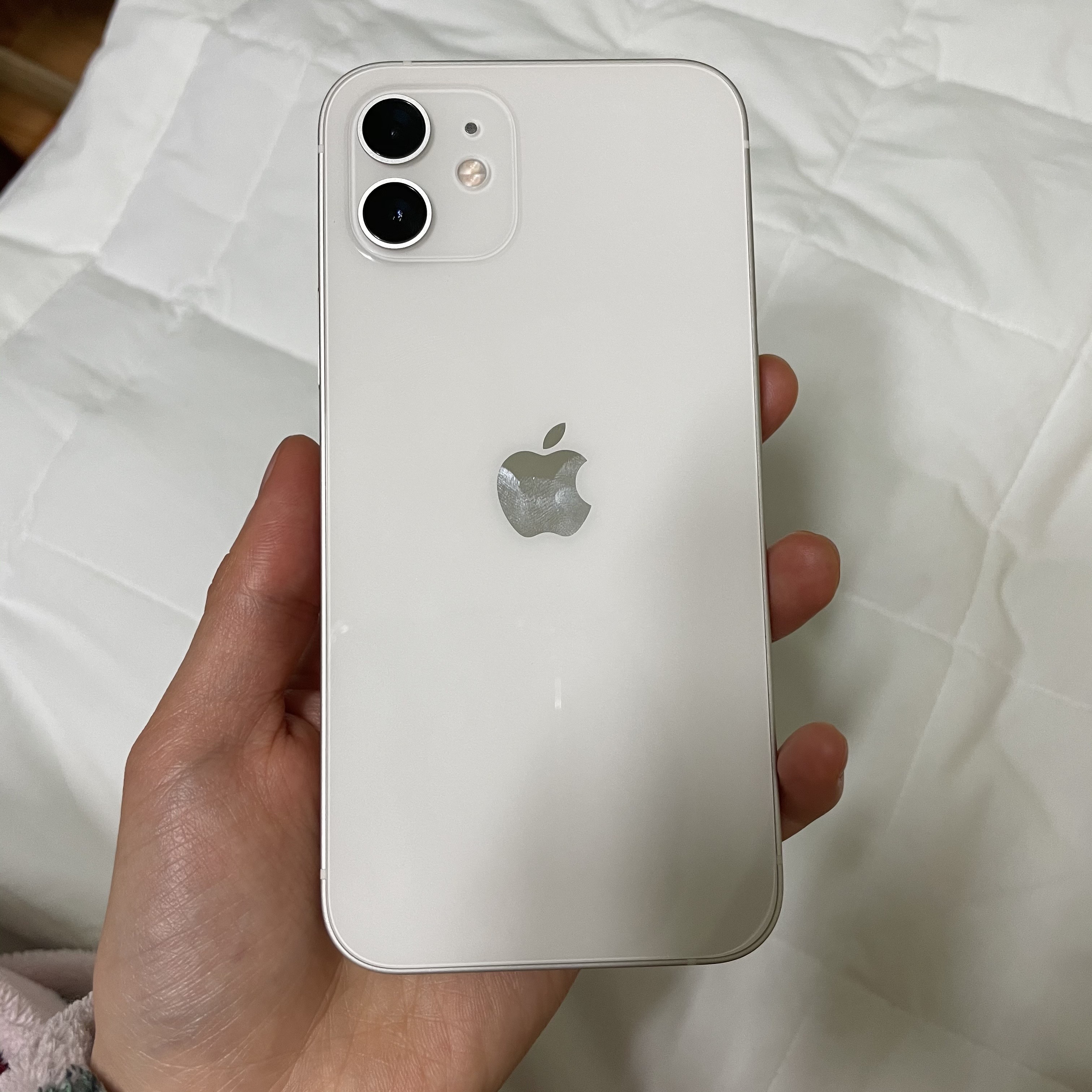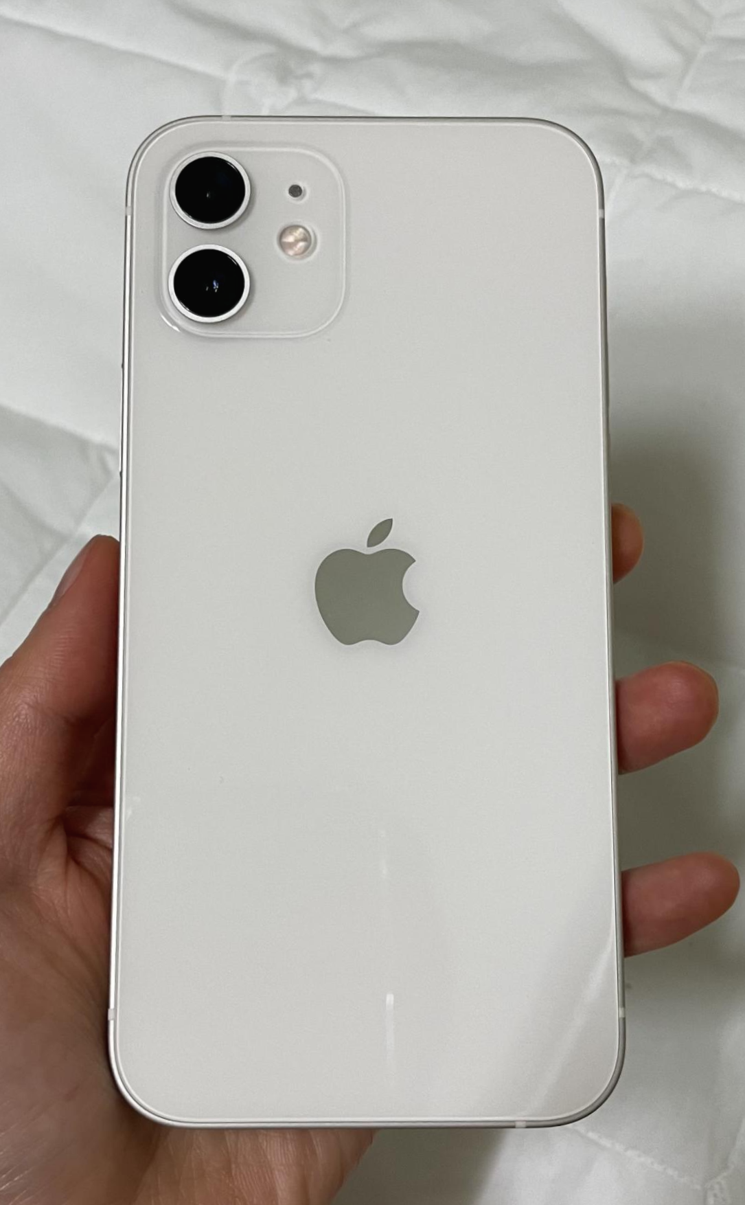 아이폰 12는 뒷면이 유광으로 되어있어서 지문 묻음이 얼마나 심할지 걱정됐었는데, 화이트 색상이라 그런지 생각보다 심하진 않았어요. 빛을 받으면 지문 묻은 게 보이긴 하는데 빛을 비추지 않는이상 지문 묻은게 잘 보이진 않아요. 지문 묻은걸 사진에 더 자세히 담고 싶었는데 생각보다 잘 안 담기더라고요. 하지만 전 케이스 씌울 거라 크게 신경 쓰지 않았습니다.