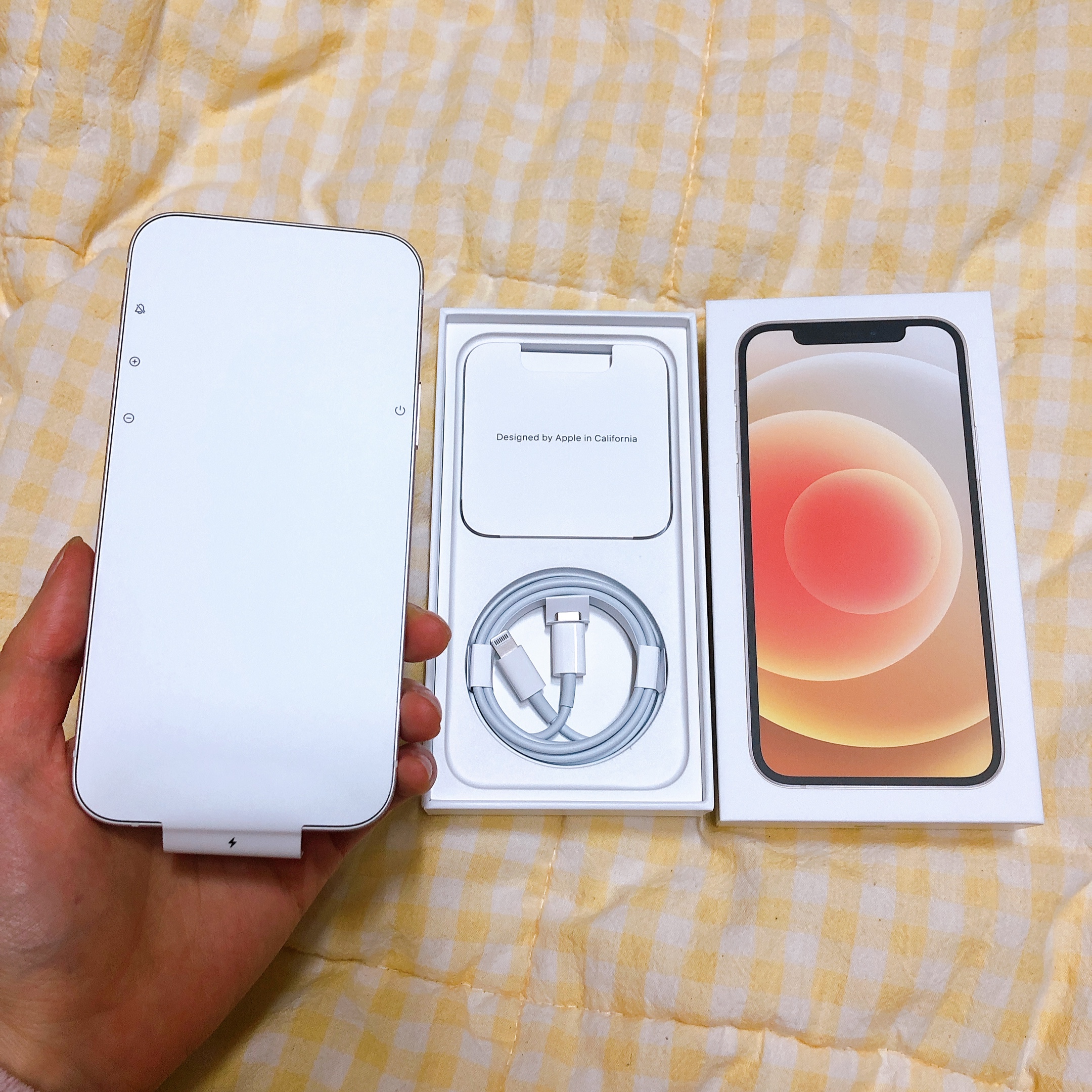 제품은 아이폰 12와 USB-C-Lightning 케이블 그리고 유심핀 이렇게 세 가지로 구성되어 있어요. 애플 로고 스티커도 같이요! 아이폰 12에 부착된 보호필름을 제거하면 따란-! 하고 영롱한 디스플레이가 나타납니다. M자 탈모가 확실히 조금 아쉽지만 그럭저럭 나쁘지 않았어요.