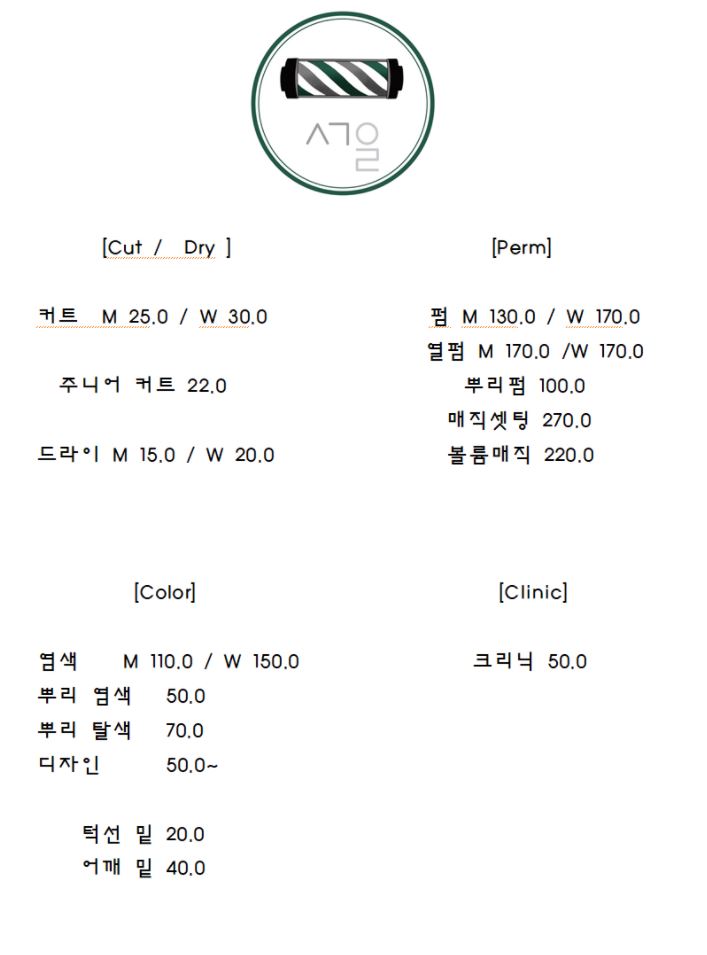 그리고 문 왼쪽에 헤어 시술 가격표가 간략하게 작성되어 있습니다!